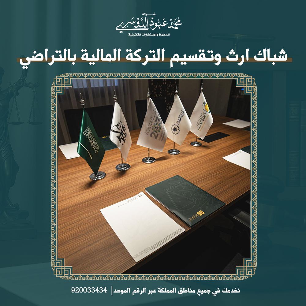 احصل على خدمات تقسيم التركة المالية بالتراضي مع فريق خبراء من شركة محمد عبود الدوسري للمحاماة والاستشارات القانونية. نوفر لك استشارات قانونية متخصصة لتقسيم الإرث وفق الأنظمة الشرعية والقانونية المعمول بها في المملكة، مما يضمن حماية حقوق جميع الورثة وتحقيق تسوية عادلة وودية. سواء كنت تبحث عن حل سريع لقضايا الإرث أو تحتاج إلى دعم قانوني في شباك الإرث، فإن خبرائنا يقدمون لك الحلول الفعّالة والدقيقة لتفادي النزاعات القانونية. احجز استشارتك الآن وتمتع بخدمة قانونية شاملة تضمن لك العدالة والشفافية في كل خطوة.